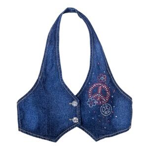 Dark Blue Wash Denim Crystal Embellished Halter-neck Tank Top Size Medium