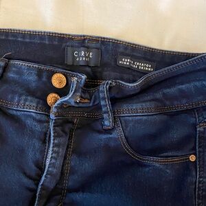 Size 8 curvy skinny jeans, dark wash and slightly worn but fair condition. Mid rise