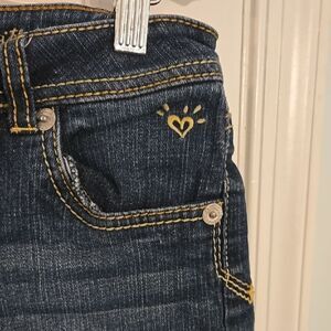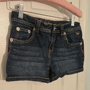 Stylish dark blue denim shorts featuring a cute heart detail. Perfect for casual wear.