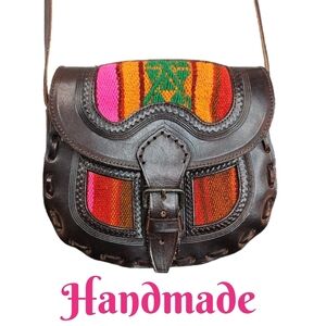 This beautiful crossbody purse is made of high-quality leather, handmade in Peru with colorful strips and a unique Peruvian stamp accent. The purse has a buckle closure and a crossbody strap that is 25 inches long and made of brown leather. It has a round shape and measures 7 inches in width, 6 inches in depth, and 6 inches in height, making it a small and versatile bag suitable for both travel and casual occasions.