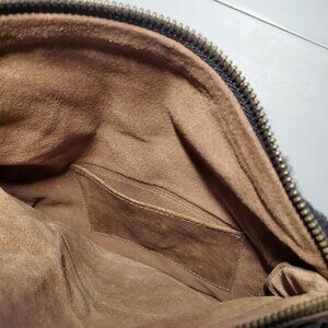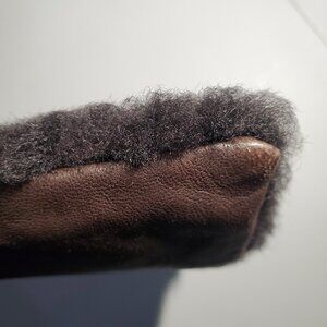 No labels or markings that I found to identify designer - beautiful rich brown leather and sherpa fold over small purse with suede lining -inside has card holder- nice heavy brass zipper with leather tassel - see all pics for measurements and condition - no issues and clean - gold hardware/strap - purse weighs 9.1ozs - shipping included in price