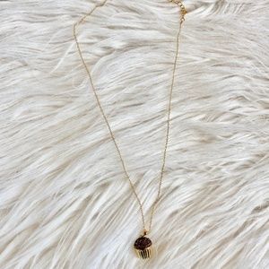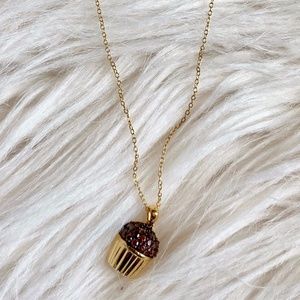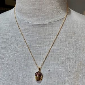 Fabulous gold tone necklace featuring a chocolate dark brown pave stone cupcake. Adjustable length spring clasp closure. 18" end to end. Excellent condition.