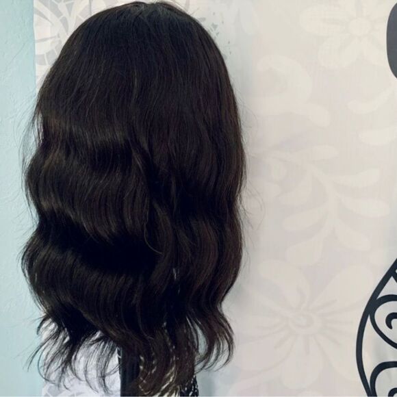 Pretty dark brown synthetic wavy wig with bangs. Shake & go. Non lace. Stretch cap with combs & adjustable straps. No brand tags and I can’t remember the brand or name. Not sure if she’s heat friendly but I have used a hot air brush on her before. Very natural looking & comfortable. Gently used maybe worn 3X. In great condition. Aprrox length 18” Size OS