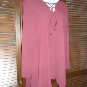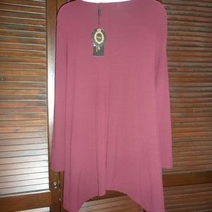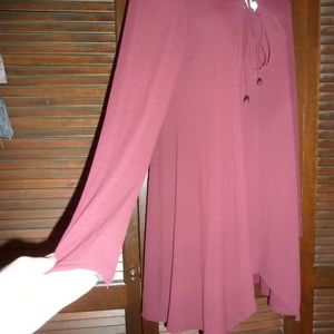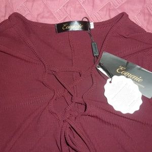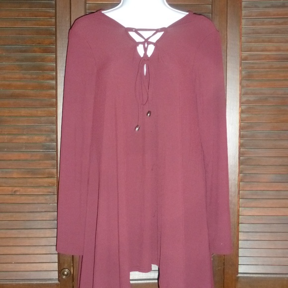 New. NWT. Pictures are a little washed out..pics 4 and 7 are most accurate to color. It's a dark shade of burgundy. Almost a brown color. The neckline has criss-cross ties. It's longer at the sides than the middle. Great with leggings or skinny jeans. Stretchy material.