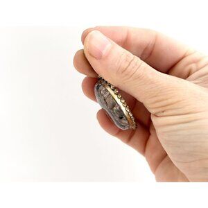 Gorgeous dark purple charoite oval gemstone pendant. The pendant has a rope accent surrounding the stone. Bail slightly tapers down. It has ribbing in the middle.
