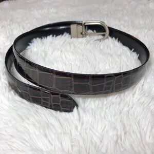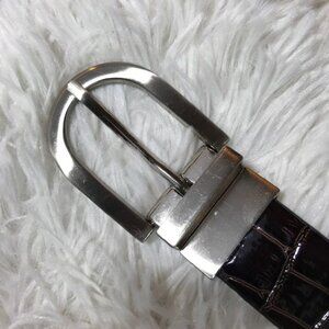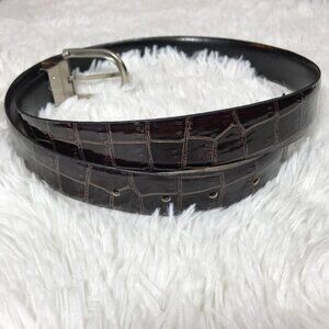 Dark Chocolate Croc Embossed Patent Leather Brushed Silver Metal Buckle Belt
