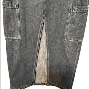 Chic drapey denim skirt. Mid-rise fit. Ideal for everyday wear. Length 32”