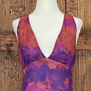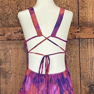 Gorgeous, Pink, orange and deep purple chiffon maxi dress. Fitted V neck bodice, flares to a tiered ruffle skirt, Sexy lace up back with elastic at waist. Colorful, festival, art to wear, one of a kind dress. THERE ARE NO TAGS AT ALL IN THIS GARMENT! From measurements appears to be a medium. 46" arm pit to hemline, 17" arm pit to arm pit. stretches at waist. This dress is perfect for any special occasion, formal event, festival, concert, wedding attire, bachelorette party dress, wedding shower, evening out. Pack this for your cruise, resort or tropical vacation!