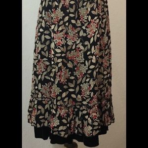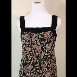 Black mini dress with tan/rosy red floral print, with zipper, about knee length.