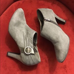 Who doesn't love a perfect pair of ankle booties? These dark gray booties with a buckle is the perfect match for your dark skinny jeans. It can instantly dress up your casual look and make you feel like you can take on the world! Besides the little stain on the right shoe these booties are in great condition :)