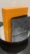 Sophisticated card holder. Features black monogram design on gray leather. Perfect for daily essentials.