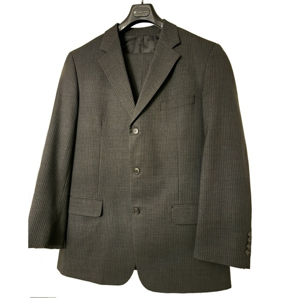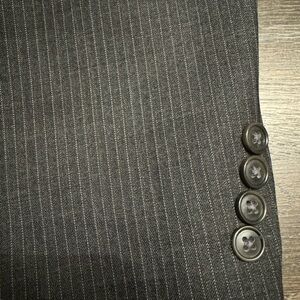 Men’s pinstripe suit size 44L. Great/Excellent condition with the exception of one button missing in the back pants pocket.