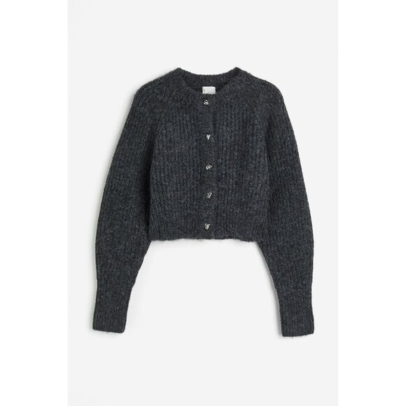 Short cardigan in a soft rib knit with wool and alpaca wool content. Round neckline, metal buttons at front, and long raglan sleeves with wide cuffs. Ribbing at neckline, cuffs, and hem.