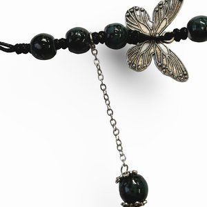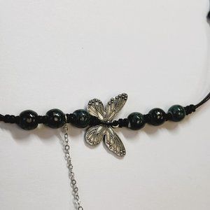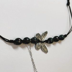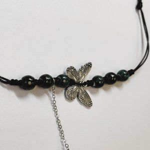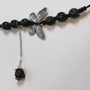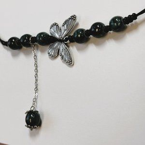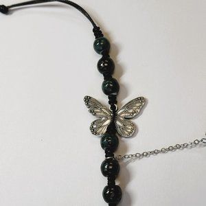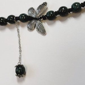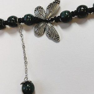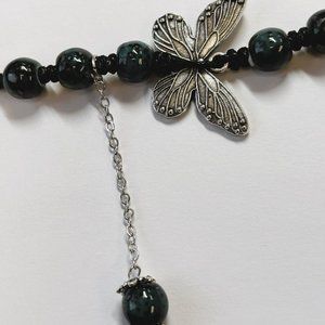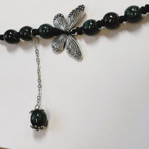 Dark Green Bead Silver Butterfly Pendant Charm Pray Vintage Necklace