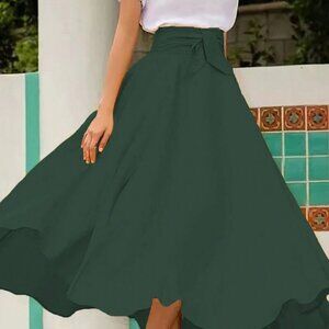 Dark Green Casual Women's Large A-Line Bow Tie Waist Midi Skirt
