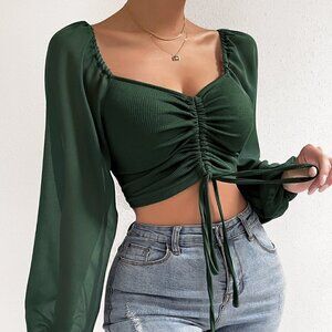 Dark Green Casual Women's Sweetheart Neck Drawstring Lantern Sleeve Crop Top