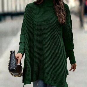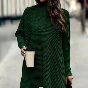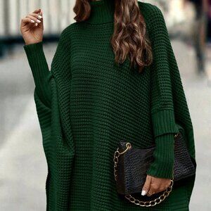 Dark Green Casual Women's Turtleneck Batwing Sleeve Poncho Sweater top