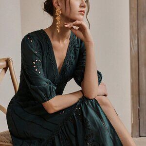 Dark Green Elegant Women's V-Neck Slit Lace Embroidered Long Dress