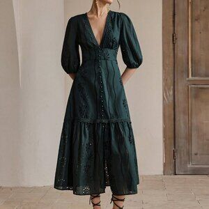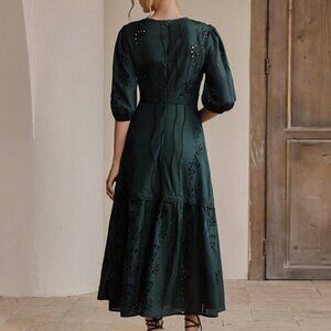 Dark Green Elegant Women's V-Neck Slit Lace Embroidered Long Dress
