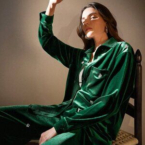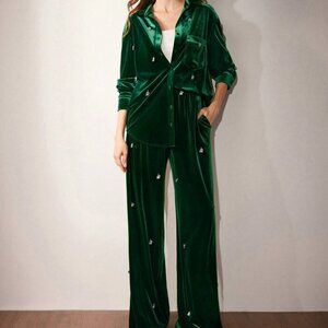 Dark Green Elegant Womens Velvet Rhinestone Studded button down top & pant Set