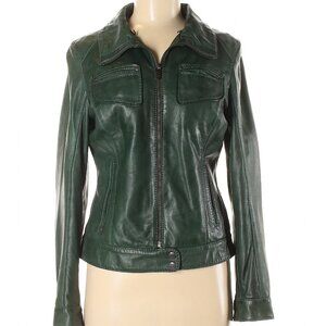 This listing is for an excellent condition dark green faux leather waist length jacket, size medium. This jacket is fully lined, has two upper breast pockets and two lower front pockets. This jacket has a zip closure. Measurements for this jacket are 19 ½ inches across and 23 inches in length. The sleeves measure 24 inches in length. Guaranteed in great condition.