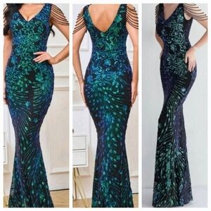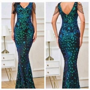 Dark Green, Floral, Sleeveless, V Neck, Contrast Sequined Mermaid Max…