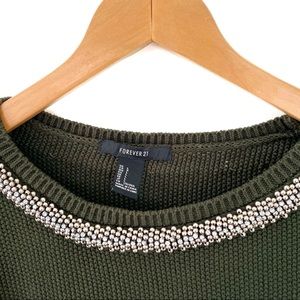 Dark hunter green thick sweater with gold and silver beaded neckline from Forever 21. Size large.