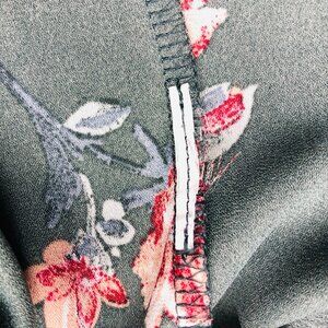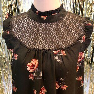 Features: Dark green blouse with delicately patterned lace yoke and circular motifs. Ruffled cap sleeves. Vibrant floral print—pink blossoms with green stems