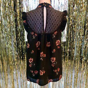 Dark Green High Neck Lace Yoke Sleeveless Blouse Ruffled Cap Sleeves Size Large