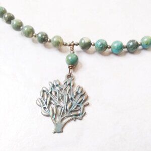 Green on green! Patina painted bronze Tree of Life Charm + bronze chain +++ loads of beautiful mottled green Jasper beads. This necklace is 16" long with an additional 2" extender [see close-up photos for details]. Need it longer than this? Ask me to splice in more chain for you...