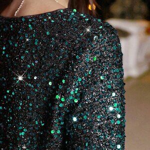 Dark Green Party Women's Sequin Glittering Long Sleeve Dress With Ruffle Hem