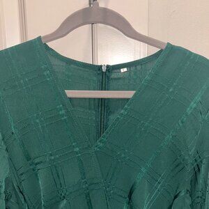 Dark Green Plaid Romper. NWOT. Size L. Plaid design in material. V-neck with snap button. Zipper in back. Ruffle bottom. TIe that can be worn in front or back.