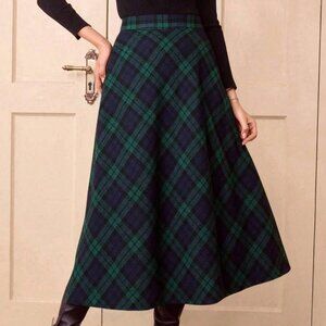 Elevate your everyday style with this dark green plaid A-line skirt, featuring a casual and elegant design. Made with a flared silhouette, this midi skirt offers a regular fit for a comfortable wear. Perfect for dressing up or down, its versatile style makes it a great addition to any wardrobe. Ideal for work or a night out.