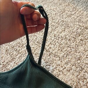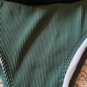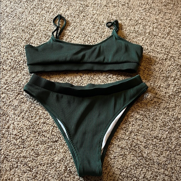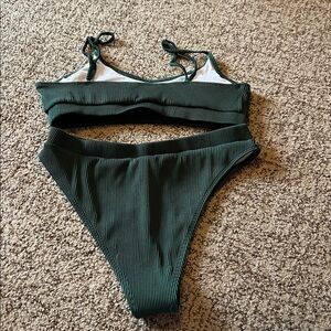 Enjoy the sun in this stylish dark green ribbed bikini set. Pads removable if wanted. Adjustable straps on top. Slightly cheeky.