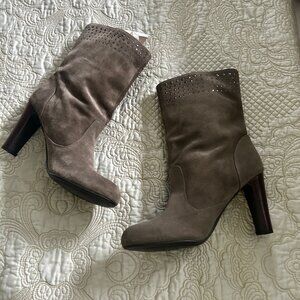 Chic and comfortable mid-calf boots for stylish everyday wear. Featuring soft suede material, rhinestone accents, and a sturdy stacked heel.