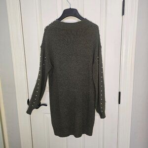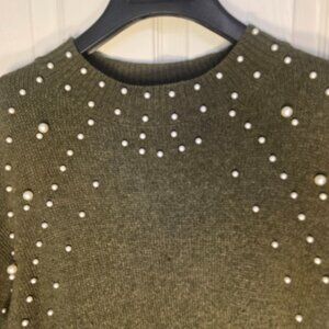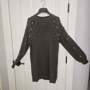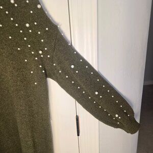 Warm woolen sweater dress with pearl details. Dark forest/moss green.