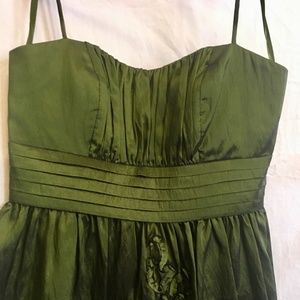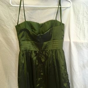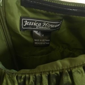 Elegant emerald green dress from Jessica Howard in a taffeta fabric. Hits just below the knees and has some tule beneath skirt to add volume. Has ruffle detailing on the bottom to add unique texture. Has small straps but could maybe be worn strapless. Size 4. Back zipper closure. Worn once to a homecoming dance.