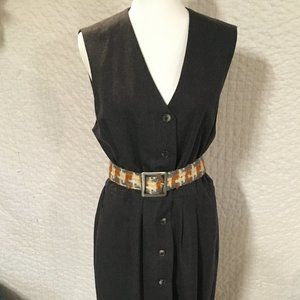 Super versatile Brooks Brother wool jumper. The button-down jumper is a dark grey with a modest v-neck. Should fall about calf-length.
