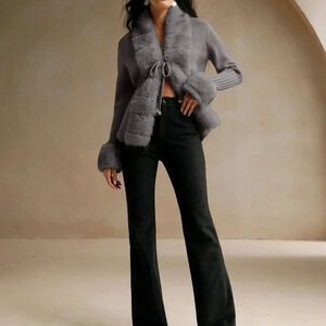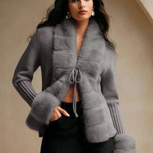 Dark Grey Casual Women's Elegant Faux Fur Knit Cardigan Sweater
