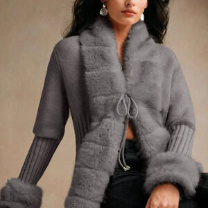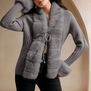 Dark Grey Casual Women's Elegant Faux Fur Knit Cardigan Sweater