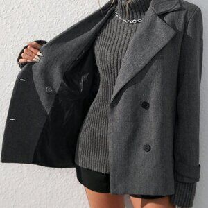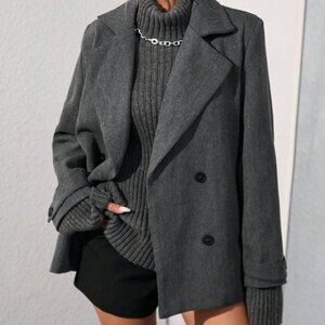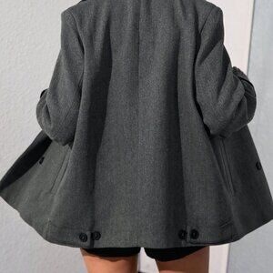 Dark Grey Casual Women's Oversized Turndown Collar Herringbone Mid-Length Jacket