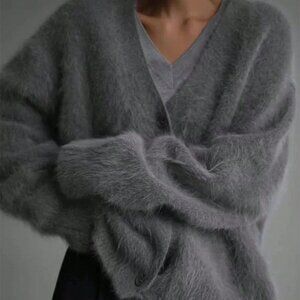 Dark Grey Casual Women's V-Neck fuzzy furry button down Sweater cardigan