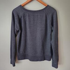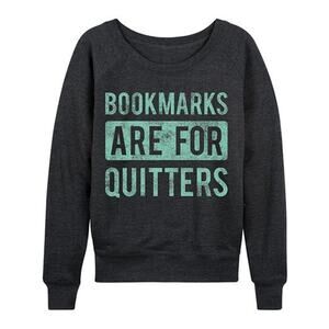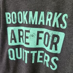 Excellent condition, size Small, long sleeve crewneck dark heathered gray sweater with mint colored text Bookmarks Are For Quitters bookish quote.