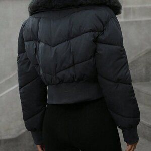 Dark Grey Chic Women's Cropped Collar Gathered Waist Faux Fur Trim Bomber Jacket
