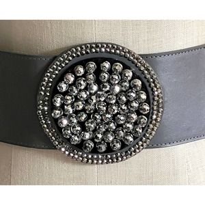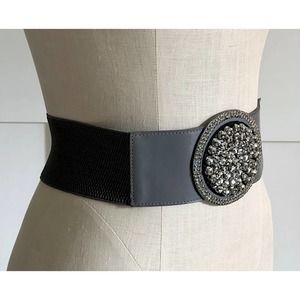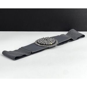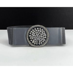 Dark grey elastic and leather belt with rhinestone front accent. Snaps in back. Size Large, not really adjustable except for stretching. 34L x 3W
