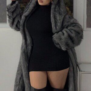 Wrap yourself in warmth this winter with a dark grey fluffy hooded coat. Designed for plus-size fit, it offers a loose silhouette, long sleeves, and a soft furry texture. The midi length provides coverage while the hood adds extra protection from the cold. Ideal for chilly days when comfort and style matter.