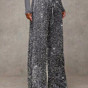 Dark Grey Party Women's Velvet Silver Sequin Drawstring Wide Leg Pants
