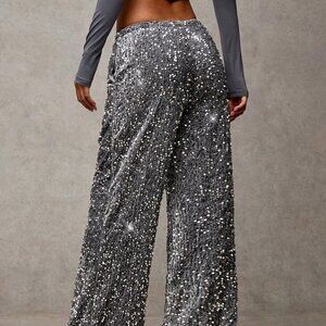 Dark Grey Party Women's Velvet Silver Sequin Drawstring Wide Leg Pants