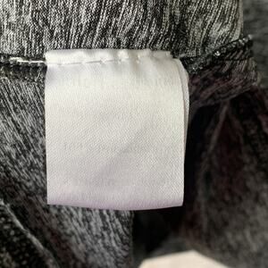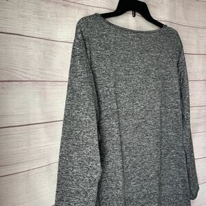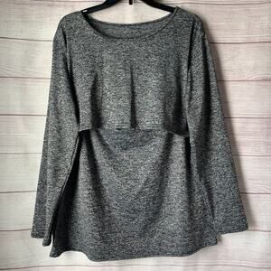 Dark heather gray long-sleeve athletic shirt. This shirt has a slightly scooped, boat neckline. The back has a horizontal slit which creates an opening between the top, crop-like part of the shirt and the bottom. It is pre-owned and in great condition.