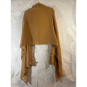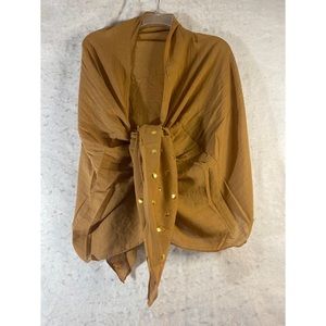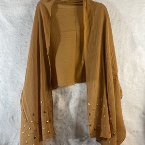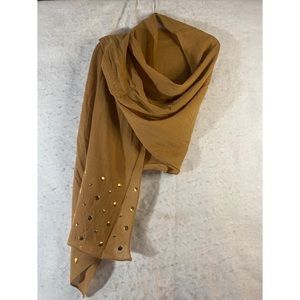 Dark Mustard Lightweight semi sheer oblong shawl scarf embellished with metal flat back gold stars and circles both ends. Dressy enough for a formal wrap or casual enough for dinner at a friends house. Approximate measurements: 26” X 79”. 100% cotton. New in package. Versatile summer scarf can be styled in many ways, wrap it around your shoulders as a shawl, drape over your hair as a scarf, tie it around your neck. Boho hippie celestial stylish trendy fashion statement bohemian bling gold stars discs circles headscarf wrap covering head cover festivals concerts